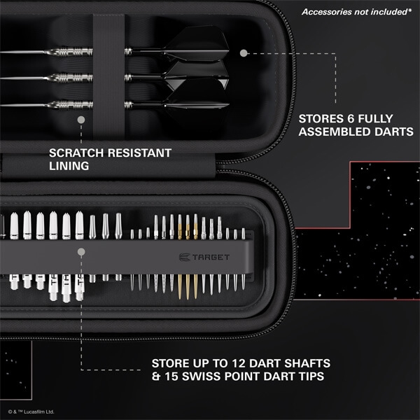 Den iögonfallande framsidan med Darth Mauls röda och svarta markeringar fångar hans hotfulla närvaro i en djärv, battle-worn design. Och det är mer än bara en hyllningslook: BOA-walleten levererar funktion i toppklass med plats för upp till 6 fullt monterade dartpilar, plus dedikerade fack för shafts, Swiss Points, flights och tillbehör.