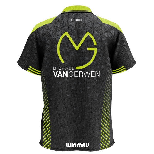 Den officiella replika av Michael van Gerwens matchtröja, designad i den ikoniska MvG Design. Tröjan är tillverkad i lätt, andningsbart performance-material, som ger maximal rörelsefrihet och effektiv fukttransport – perfekt för både turnering, träning och fans som vill stödja MvG.