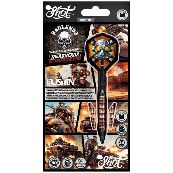 Med sin torpedoform och det markanta Throttlefang Grip levererar Shot Badlands Rustin 90% en dartpil som kombinerar aggressivt grepp, jämnt release och konsekvent precision i varje kast.