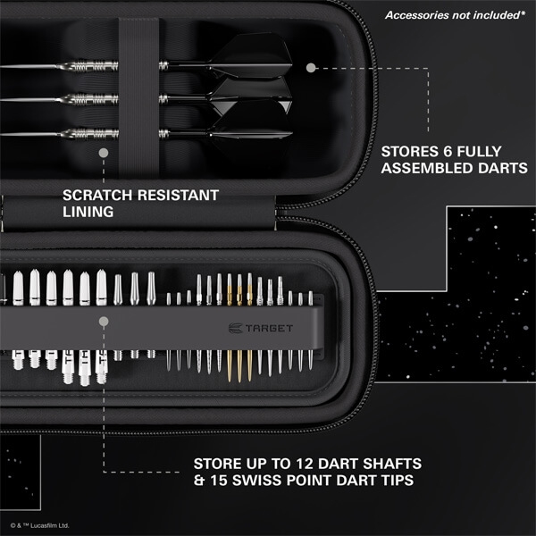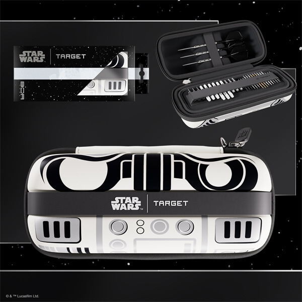 Med sin klassiska vita rustning och markanta svarta detaljer fångar walleten Stormtrooperens igenkännliga uttryck och för Star Wars™-universumet direkt till dartbanan. Invändigt får du plats för 6 fullt monterade dartpilar, ett traysystem för 12 shafts och 15 Swiss Point-spetsar – den enda dart-wallet i galaxen med dedikerad Swiss Point-förvaring!