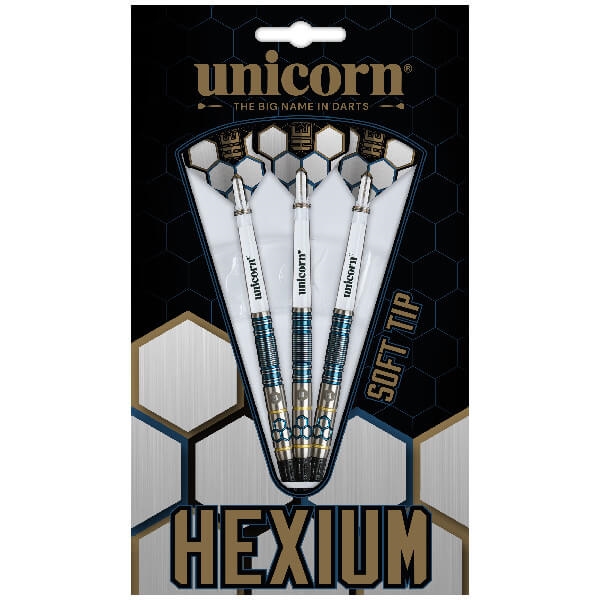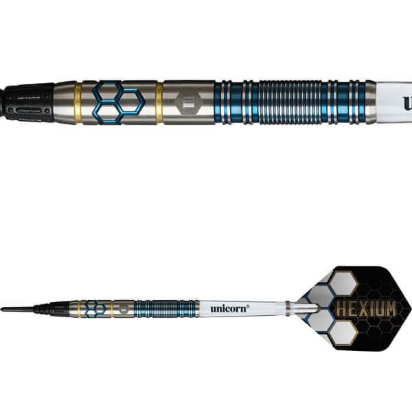 Unicorn Hexium Blue 90% Tungsten Soft Tip Darts – japansk precision, bakgrepp och djärv design.