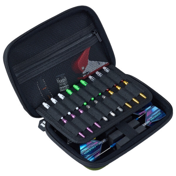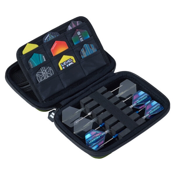 Fodralet har plats för två kompletta set monterade dartpilar, 9 flight-fickor, 18 skaft-hållare och ett praktiskt blixtlåsfack för extra tillbehör.